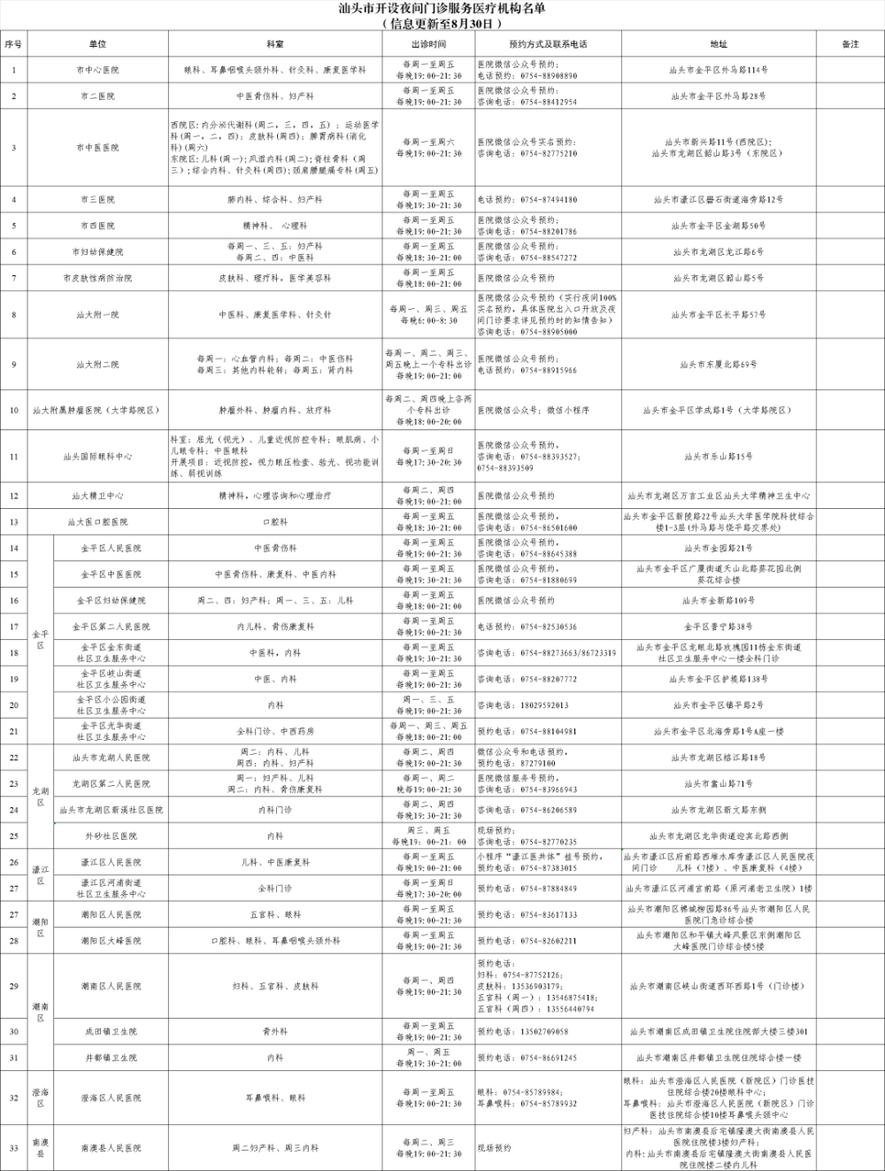 根据《关于在“党建引领·医心为民 卫健在行动”实践活动中全面推广夜间门诊的实施方案》工作部署,现将汕头市开设夜间门诊服务医疗机构信息公示如下: