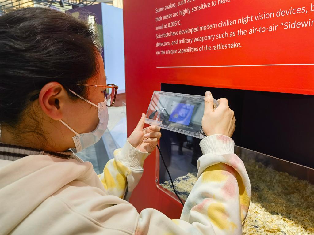 游客在上海自然博物馆里通过红外互动装置了解蛇如何“锁定”猎物