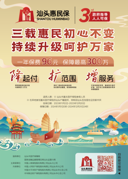 2024年度“汕头惠民保”将继续坚持为老百姓办更多好事、实事的初心使命,持续扩大参保规模,稳步提升待遇水平,体现“汕头惠民保”商业保险项目的社会责任感,提升“汕头惠民保”的社会公信力,增强汕头老百姓的获得感、幸福感和安全感。