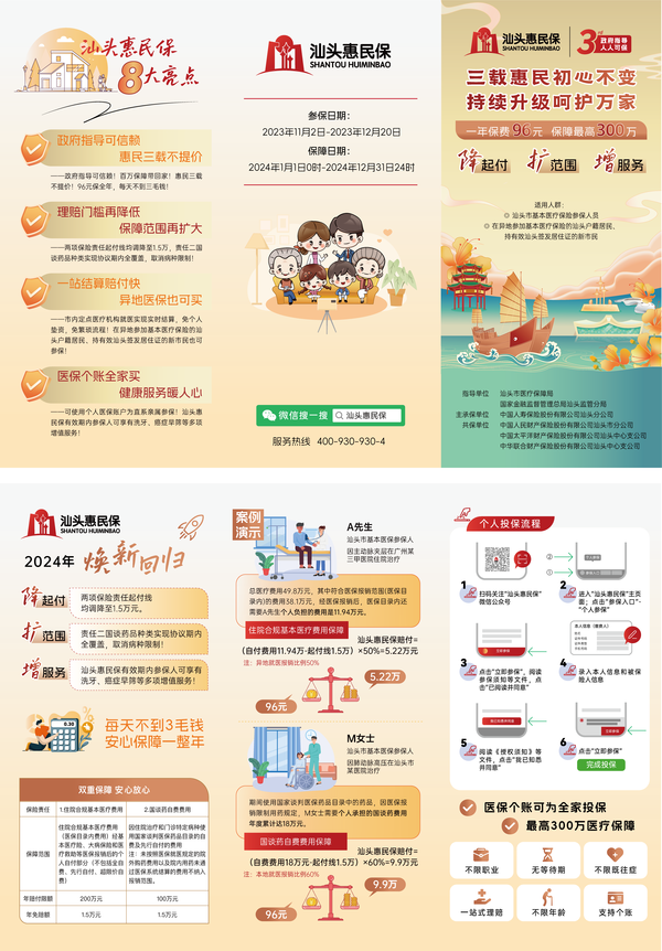 据汕头市医保局和金融监管总局汕头监管分局负责人和相关保险公司代表介绍,迈入第三个年度,汕头惠民保2024年度保障方案再次优化,在维持保费96元不变的基础上,通过“降、扩、增”三大升级: